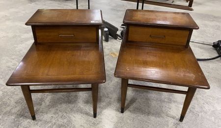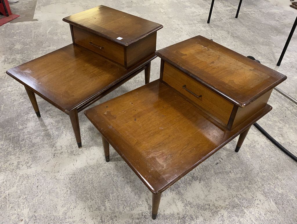 Pair of Mid Century Step Up Tables, single drawer, oak, 21"h., 29"w. Location 6th Row Pair of Mid Century Step Up Tables, single drawer, oak, 21"h., 29"w. Location 6th Row