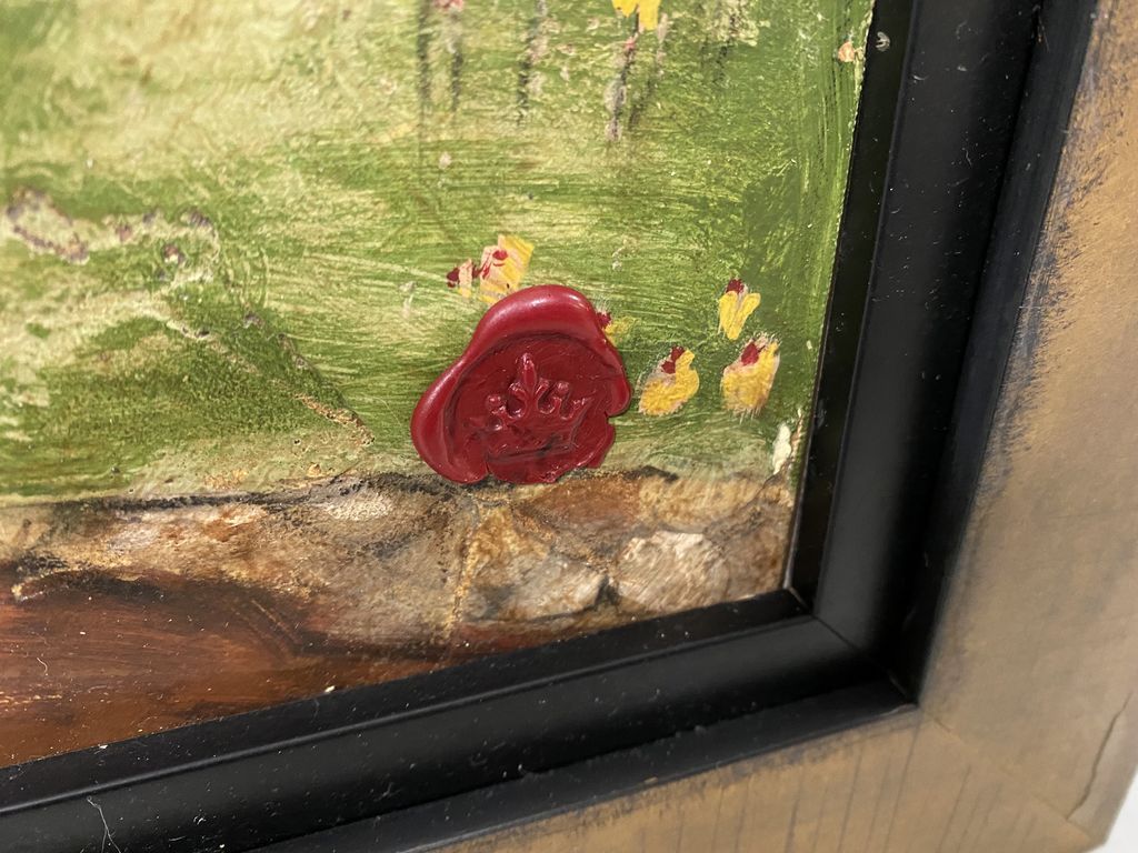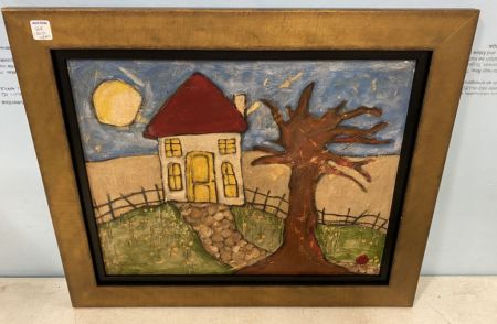"House on a Hill" with an "Ol Gnarly Tree in the Yard" artwork, stamp signed, frame is 22"h., 25"w. Location Left Office. "House on a Hill" with an "Ol Gnarly Tree in the Yard" artwork, stamp signed, frame is 22"h., 25"w. Location Left Office.