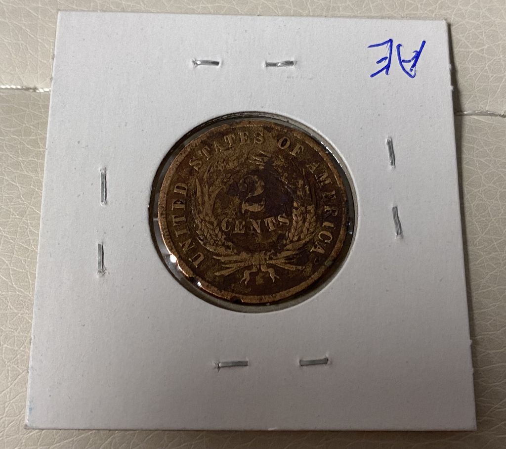 1865 Two Cent Piece, cleaned, paper case 1865 Two Cent Piece, cleaned, paper case