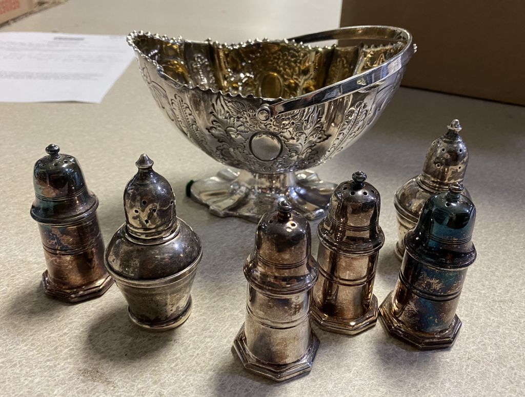 Sterling and Silver Plate Salt & Pepper Shakers and Silver Plate Basket. Location Front Left Glass Showcase. Sterling and Silver Plate Salt & Pepper Shakers and Silver Plate Basket. Location Front Left Glass Showcase.