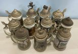 11 Collectible German Beer Steins, 7 porcelain, four glass steins. 11 Collectible German Beer Steins, 7 porcelain, four glass steins.