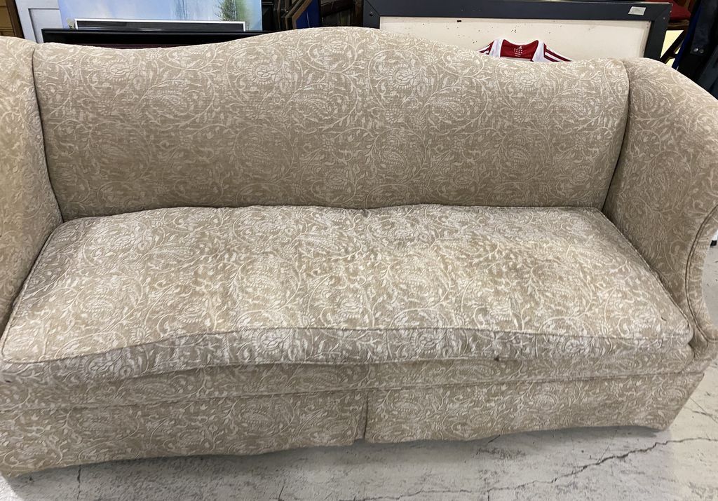 Single Cushion Sofa, floral pattern, good condition, 7' long. Location 1st Row Single Cushion Sofa, floral pattern, good condition, 7' long. Location 1st Row