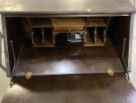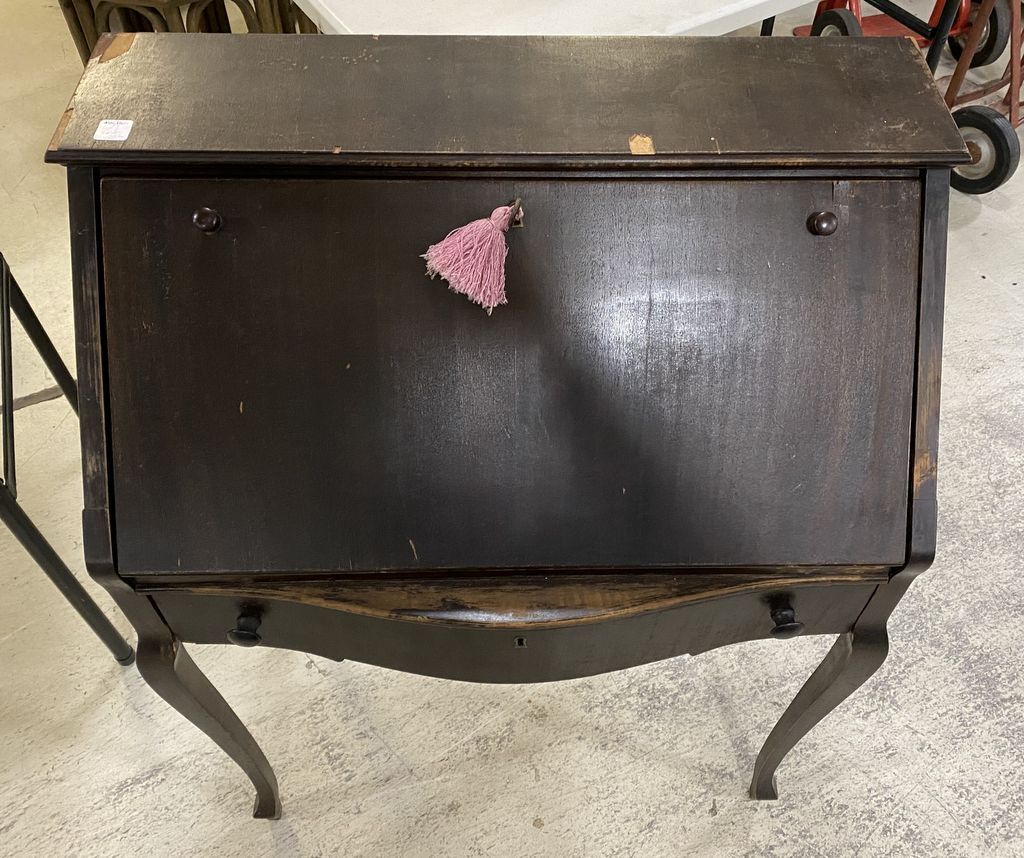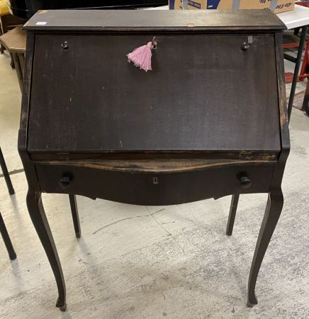 Vintage Mahogany Writing Desk, drop front des, single drawer, has worn finish, veneer chips, 39"h., 28"w. Location 5th Row Vintage Mahogany Writing Desk, drop front des, single drawer, has worn finish, veneer chips, 39"h., 28"w. Location 5th Row