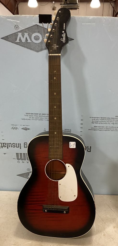 Stella Harmony Acoustic Guitar, vintage, used, missing few strings, 36"h. Location 6th Row Stella Harmony Acoustic Guitar, vintage, used, missing few strings, 36"h. Location 6th Row