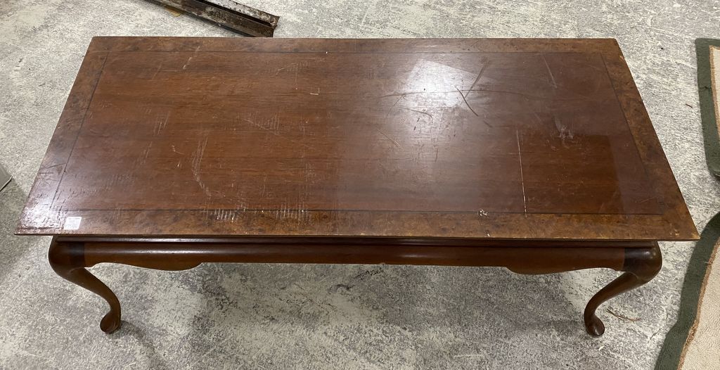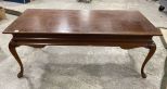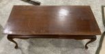 Mahogany Queen Anne Coffee Table, finish is worn, 18"h., 46"w. Location 5th Row Mahogany Queen Anne Coffee Table, finish is worn, 18"h., 46"w. Location 5th Row
