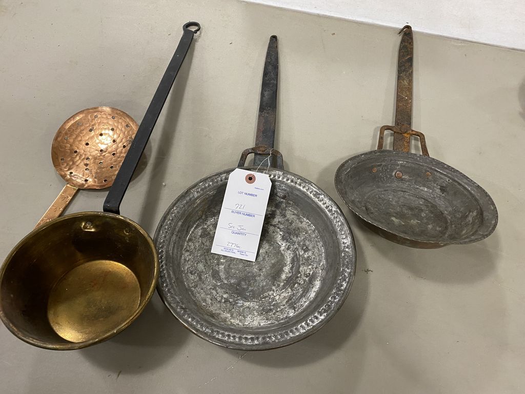Antique Copper and Brass Pans, some primitive. Location Back Metal Cases Antique Copper and Brass Pans, some primitive. Location Back Metal Cases