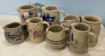 8 Stoneware Crock Pitchers, some Marshall Brand, blue label, blue painted. Location Back Metal Cases 8 Stoneware Crock Pitchers, some Marshall Brand, blue label, blue painted. Location Back Metal Cases
