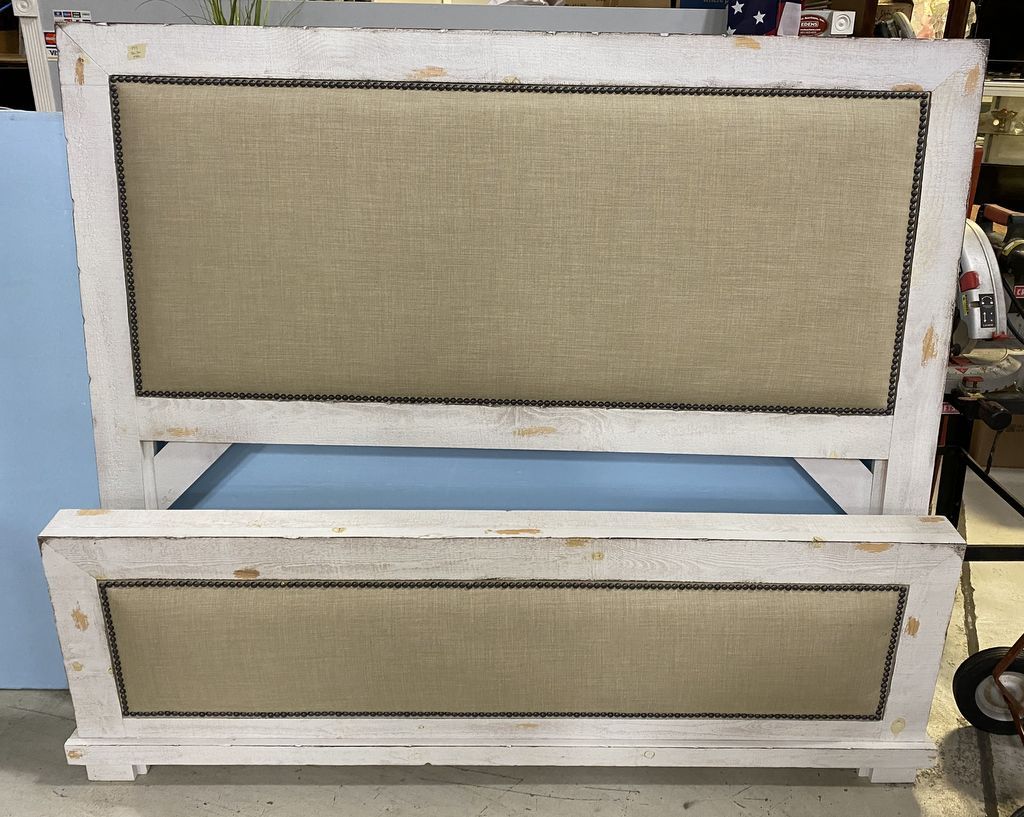 White Painted Farmhouse Style Queen Bed, fabric backs, white matching rails. Location Right Office. White Painted Farmhouse Style Queen Bed, fabric backs, white matching rails. Location Right Office.