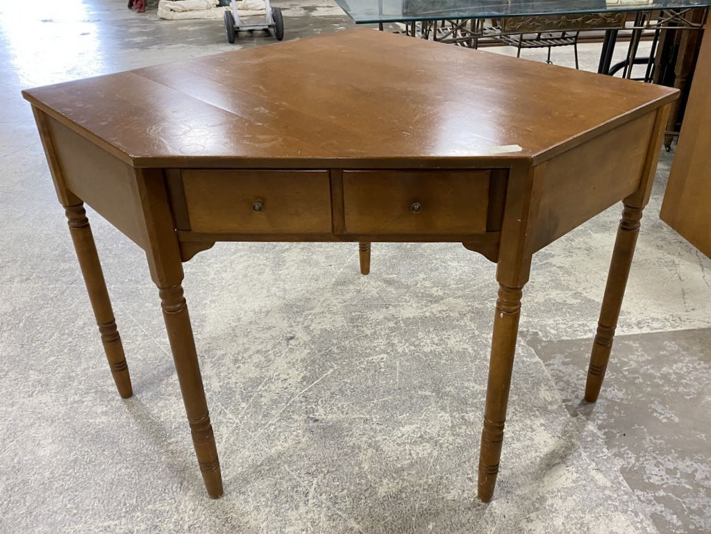 Ethan Allen Corner Desk, cherry, single drawer, 30"h., 48"w., 37"d. Location 3rd Row. Ethan Allen Corner Desk, cherry, single drawer, 30"h., 48"w., 37"d. Location 3rd Row.