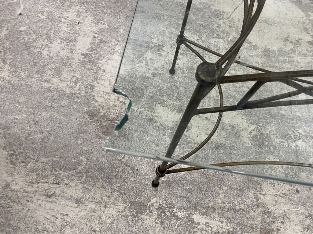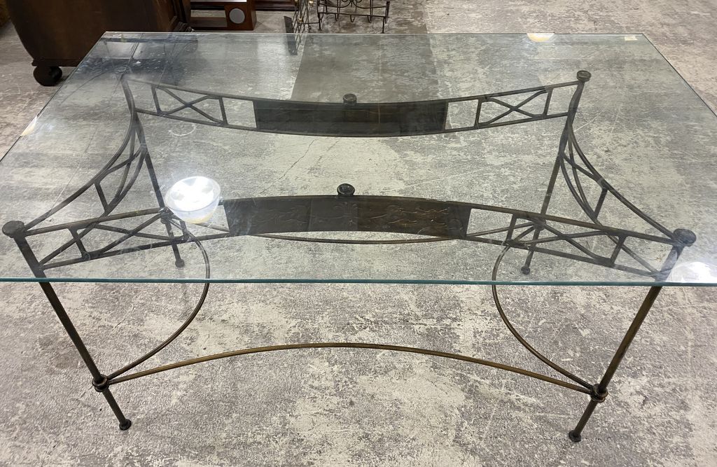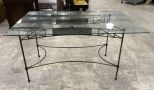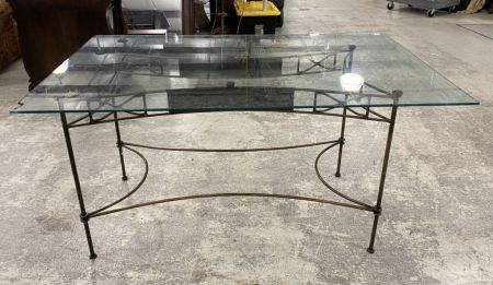 Wrought Iron Glass Top Dining Table, iron base, glass has corner chip, 30"h., 60"long, 36"w. Location 2nd Row. Wrought Iron Glass Top Dining Table, iron base, glass has corner chip, 30"h., 60"long, 36"w. Location 2nd Row.