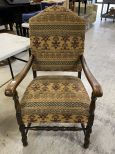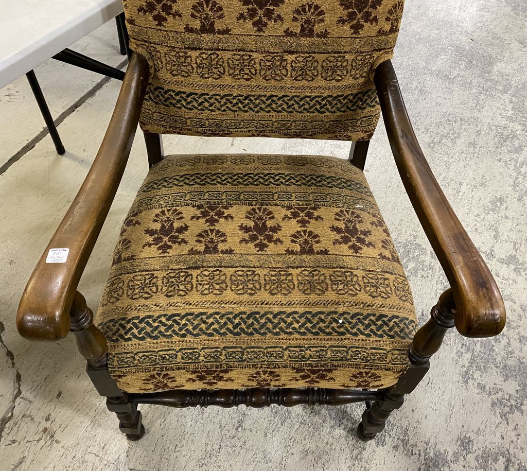 Upholstered Mahogany Arm Chair, light wear on finish. Location Right Office. Upholstered Mahogany Arm Chair, light wear on finish. Location Right Office.