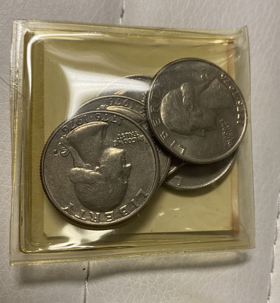 4 Centennial Quarters, 1 plain, plastic case. 4 Centennial Quarters, 1 plain, plastic case.