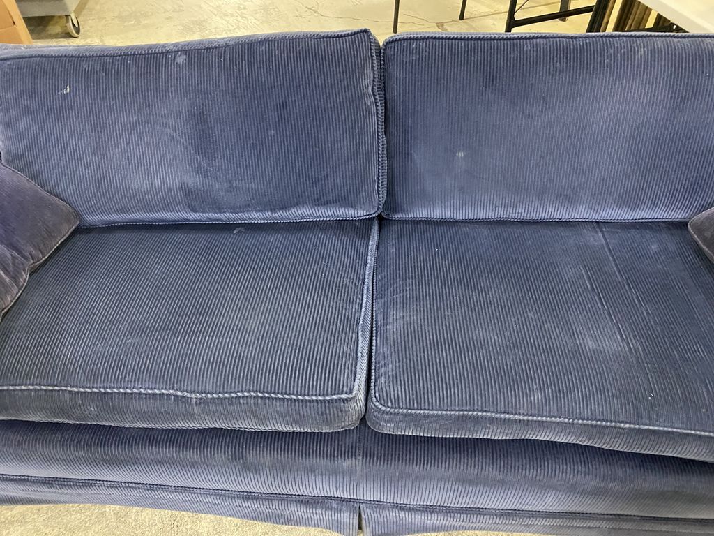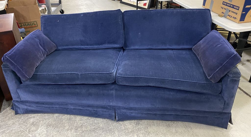Knob Creek Blue Two Cushion Sofa, light age wear. Location 1st Row. Knob Creek Blue Two Cushion Sofa, light age wear. Location 1st Row.