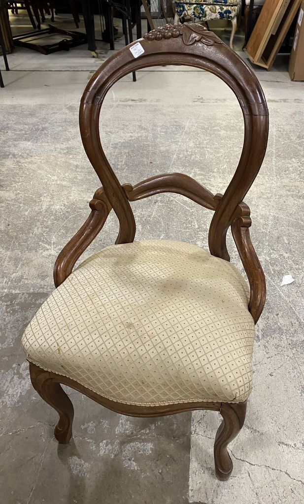 French Style Side Chair, mahogany, stained cushion. Location Right Back Black Metal Shelves. French Style Side Chair, mahogany, stained cushion. Location Right Back Black Metal Shelves.