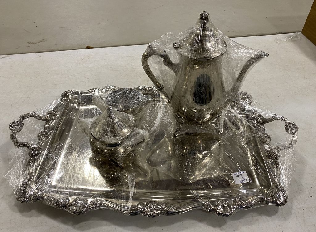 1049 Silver Plate Serving Tray, Coffee Pitcher, Sugar, and Creamer