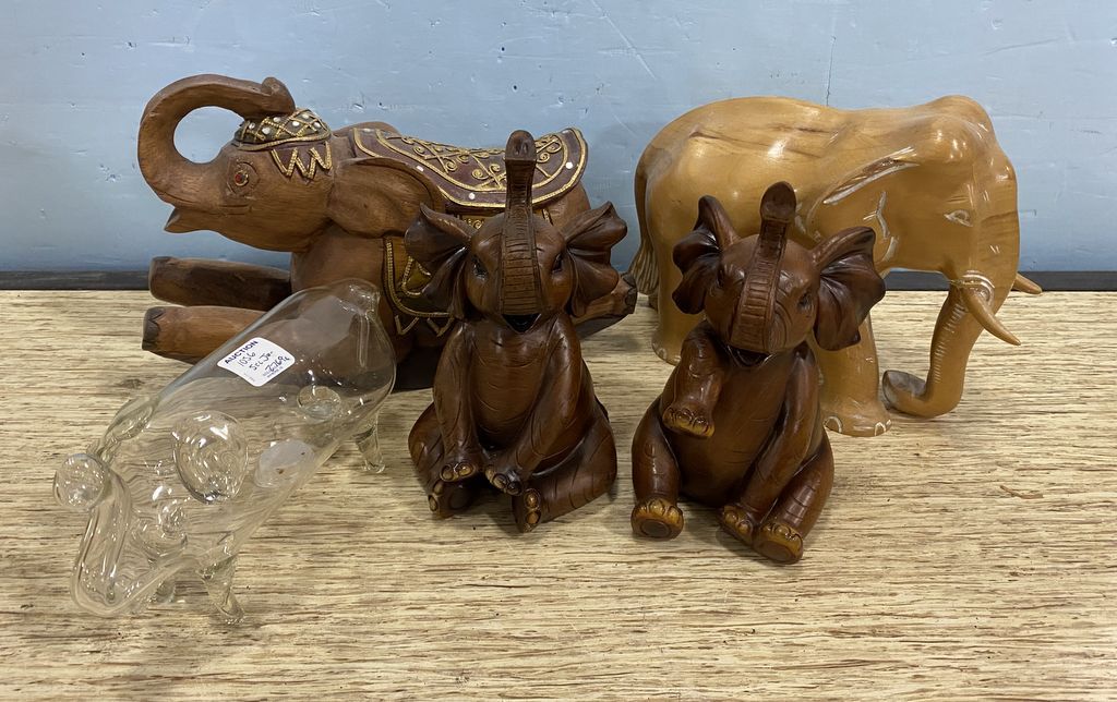 Elephants Decorations and Glass Piggy Bank. Location Right Metal Shelves. Elephants Decorations and Glass Piggy Bank. Location Right Metal Shelves.