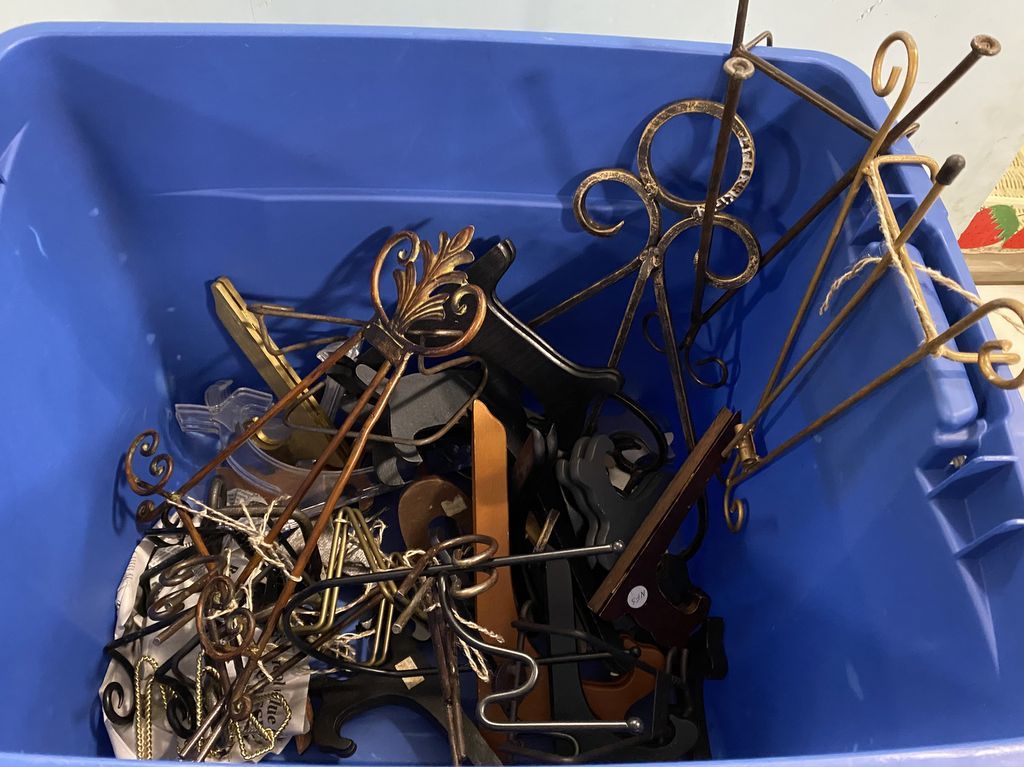 Box Lot of Assorted Plate Stands and Racks, in plastic tub. Location 5th Row Box Lot of Assorted Plate Stands and Racks, in plastic tub. Location 5th Row