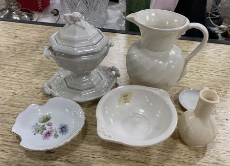 Pottery Pitcher, gravy, small pitcher, bowls, Location Back Metal Cases Pottery Pitcher, gravy, small pitcher, bowls, Location Back Metal Cases