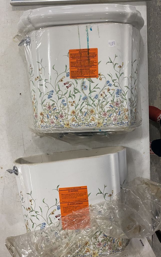 Two Kohler Toilet Backs, one with a crack. Location Right Metal Shelves. Two Kohler Toilet Backs, one with a crack. Location Right Metal Shelves.