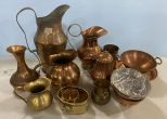 Group of copper and brass pitcher and bowls, Location Right Metal Shelves Group of copper and brass pitcher and bowls, Location Right Metal Shelves