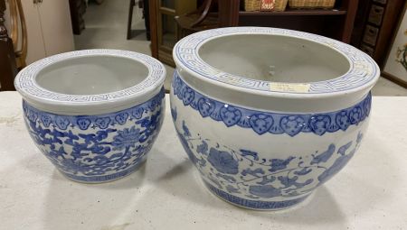 Two Blue and White Asian Porcelain Planters, floral design, largest is 9"h., 12"dia. Left Plastic Storage Racks. Two Blue and White Asian Porcelain Planters, floral design, largest is 9"h., 12"dia. Left Plastic Storage Racks.