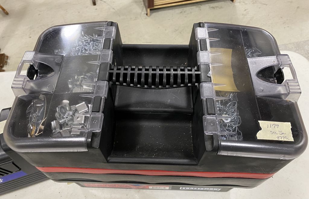 Craftsman Tool Organizer, has assorted tools, and Campbell Hausfeld Air Compressor. Left Plastic Storage Racks. Craftsman Tool Organizer, has assorted tools, and Campbell Hausfeld Air Compressor. Left Plastic Storage Racks.