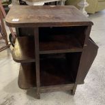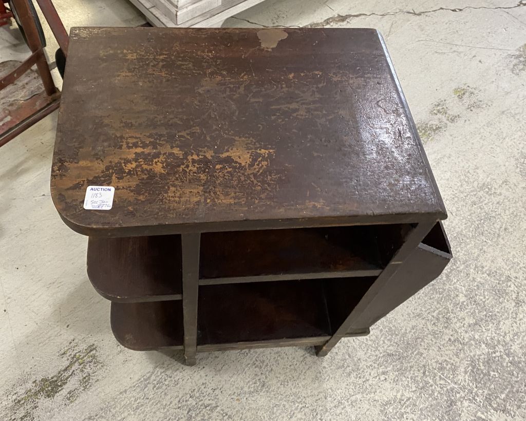 Mahogany Magazine Stand, finish is worn, 22"h., 18"w. Location 5th Row Mahogany Magazine Stand, finish is worn, 22"h., 18"w. Location 5th Row