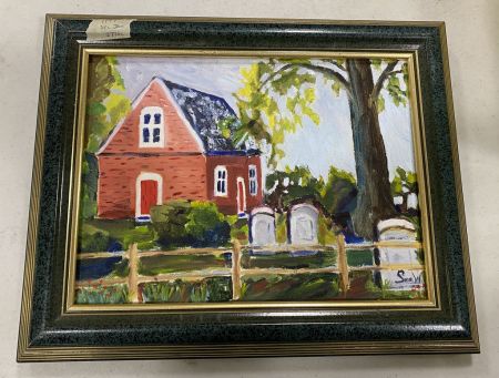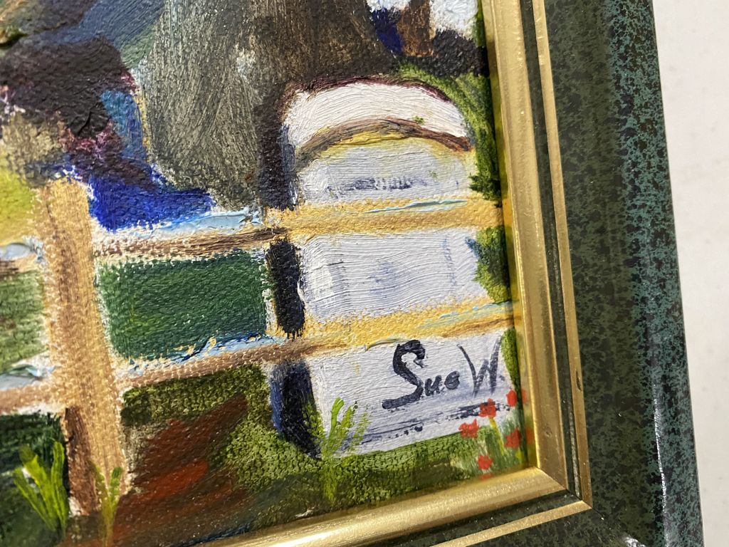 Sue W. Signed Painting of Home, on canvas, framed, 12"h., 15"w. Location Back Metal Cases Sue W. Signed Painting of Home, on canvas, framed, 12"h., 15"w. Location Back Metal Cases