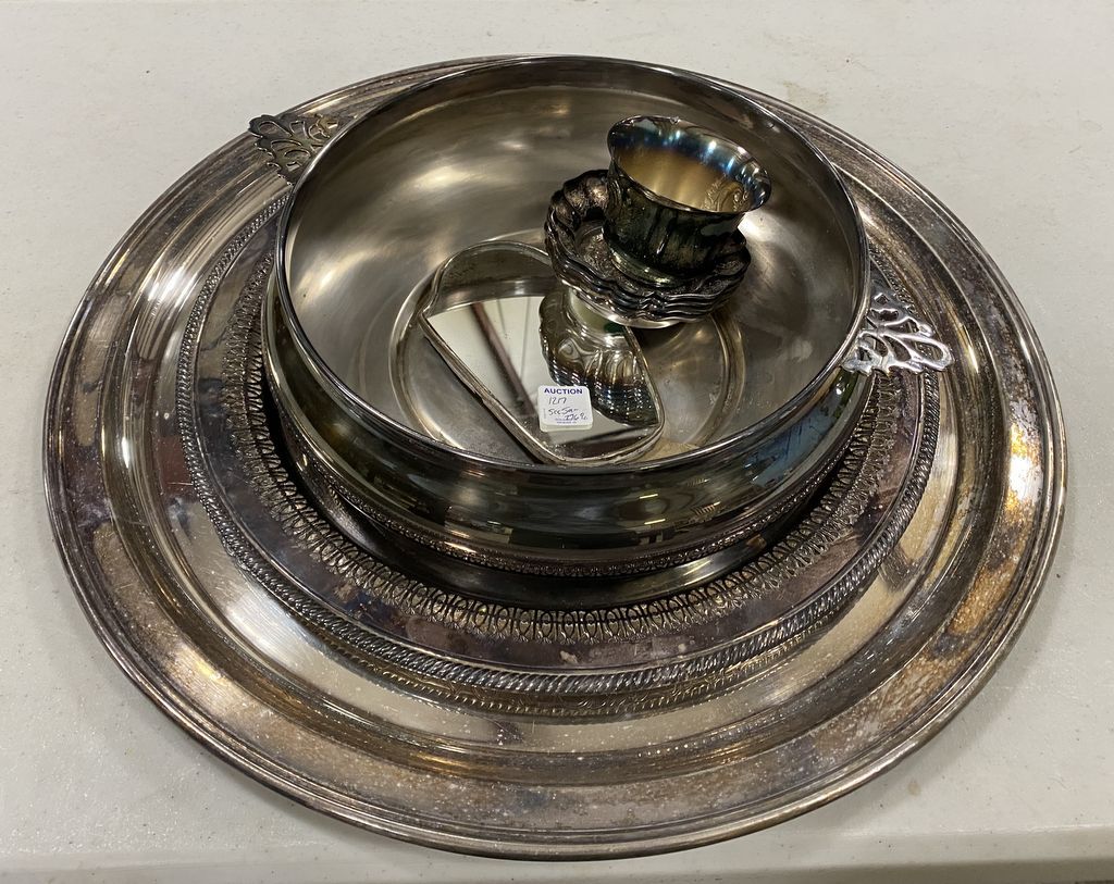 Large Silver Plate Trays, silver plate bowls, dishes, cups. Location Back Metal Cases Large Silver Plate Trays, silver plate bowls, dishes, cups. Location Back Metal Cases