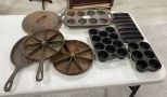 Group of Old Iron Skillets and Pans. Left Plastic Storage Racks. Group of Old Iron Skillets and Pans. Left Plastic Storage Racks.