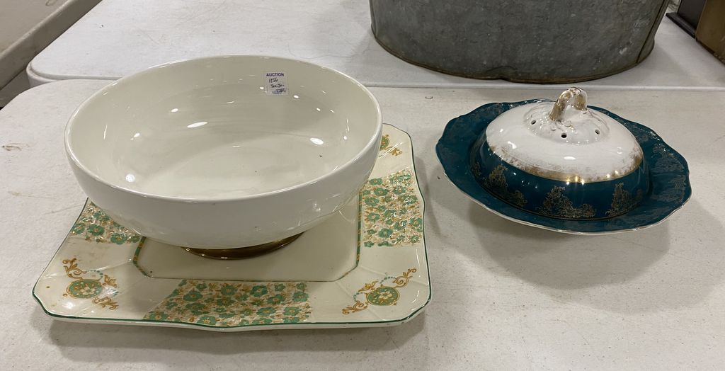 Square Porcelain Tray, Covered Dish, and Salad Bowl, Location Back Metal Cases Square Porcelain Tray, Covered Dish, and Salad Bowl, Location Back Metal Cases