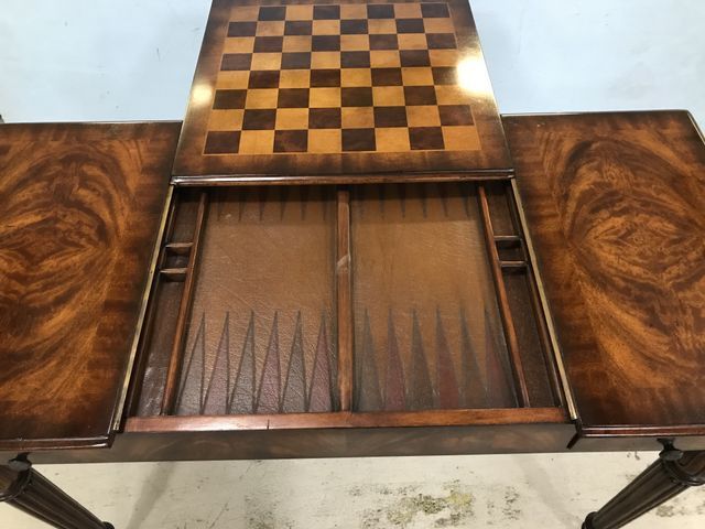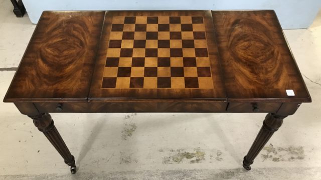 Theodore Alexander Gaming Table, games chess, checkers & backgammon, two drawers, burl finish, good condition, 30"h., 43"w., 20"d. Theodore Alexander Gaming Table, games chess, checkers & backgammon, two drawers, burl finish, good condition, 30"h., 43"w., 20"d.