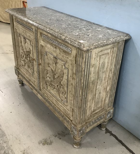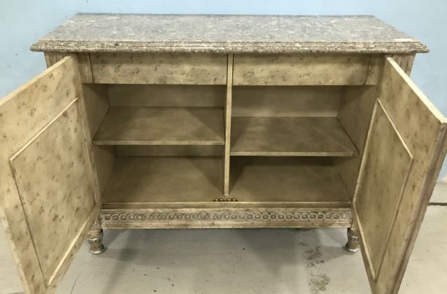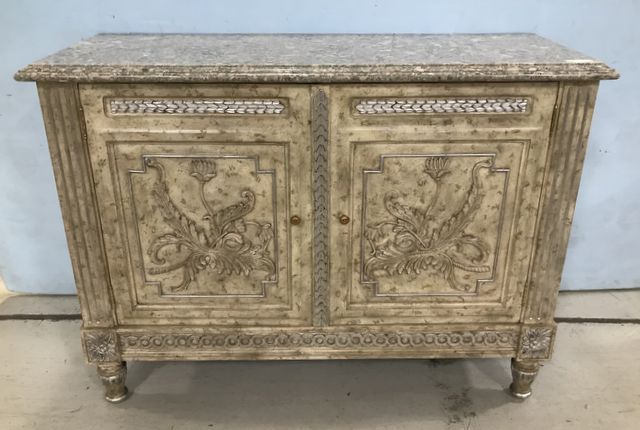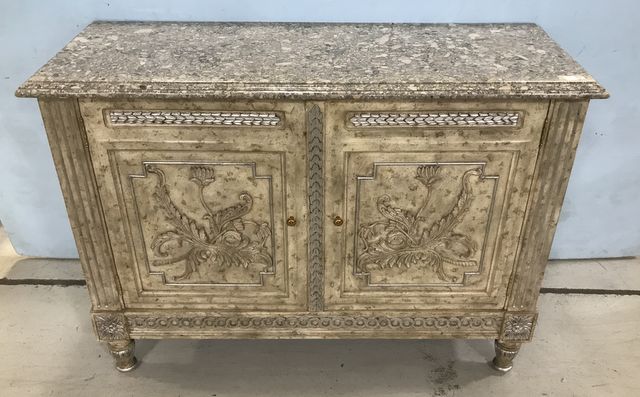 Maitland-Smith French Style Commode, factory painted, distressed, double door, two drawers, marble panel top, 38"h., 51"w., 18"d. Maitland-Smith French Style Commode, factory painted, distressed, double door, two drawers, marble panel top, 38"h., 51"w., 18"d.