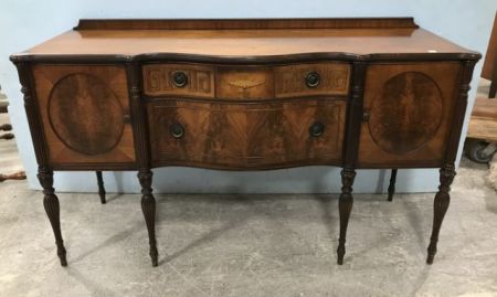 Antique Reproduction Federal Style Buffet, vintage, two door, tow drawer, burl finish, dove tailed, minor scratches on finish, 39"h., 66"w., 22"d. Antique Reproduction Federal Style Buffet, vintage, two door, tow drawer, burl finish, dove tailed, minor scratches on finish, 39"h., 66"w., 22"d.