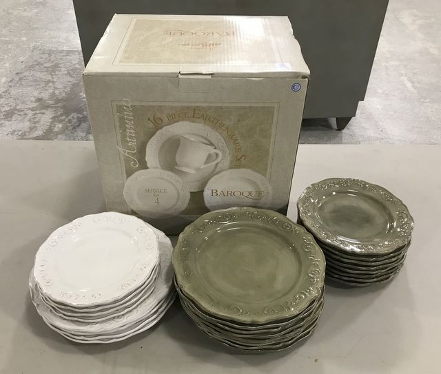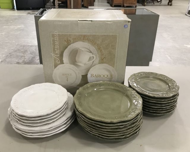16 Piece Earthernware Set and Additional Earthernware Plates, 8 Beige plates, 16 green plates, Baroque Beige, good condition. 16 Piece Earthernware Set and Additional Earthernware Plates, 8 Beige plates, 16 green plates, Baroque Beige, good condition.