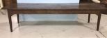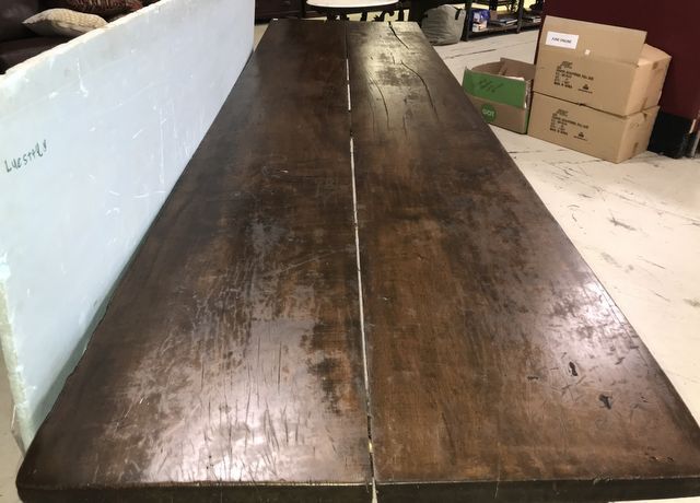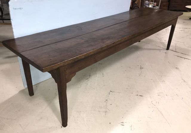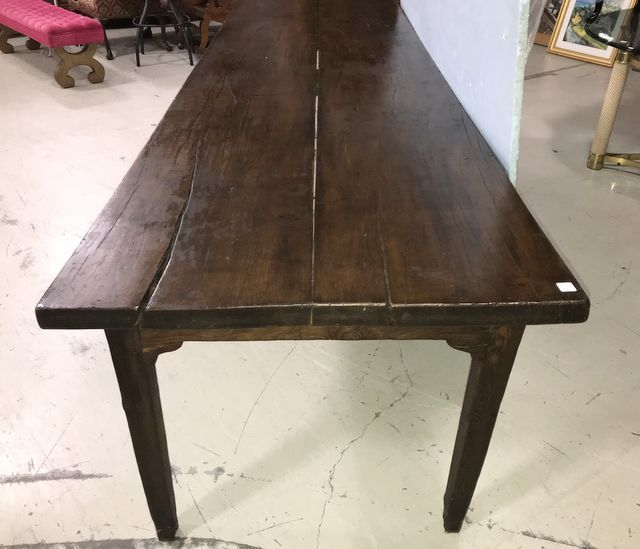 Huge antique Farm table, hand planed, tapered legs, age splits on one end, good condition, one piece, 31"h., 10'6 long, 2'10 wide. Huge antique Farm table, hand planed, tapered legs, age splits on one end, good condition, one piece, 31"h., 10'6 long, 2'10 wide.