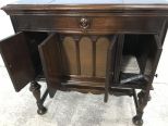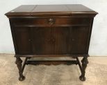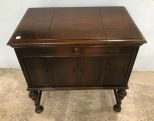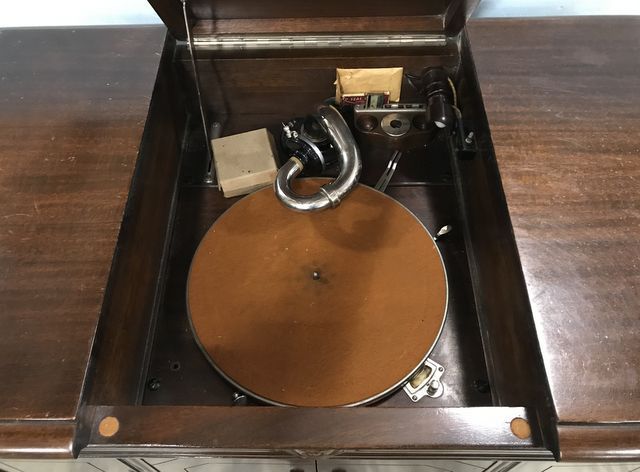 Victor Talking Machine Co. Victrola, Orthophonic victrola spring motor type, comes with instructions, untesed, nice cherry cabinet with speaker and record storage, lighted, 33"h., 34"w., 21"d. Victor Talking Machine Co. Victrola, Orthophonic victrola spring motor type, comes with instructions, untesed, nice cherry cabinet with speaker and record storage, lighted, 33"h., 34"w., 21"d.