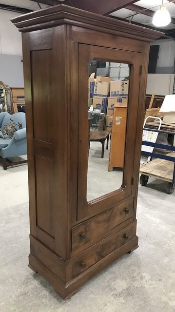 Vintage Single Door Wardrobe, single mirrored door, cloths hanging rails, burl finish drawers, good condition, 76"h., 33"w., 18"d. Vintage Single Door Wardrobe, single mirrored door, cloths hanging rails, burl finish drawers, good condition, 76"h., 33"w., 18"d.