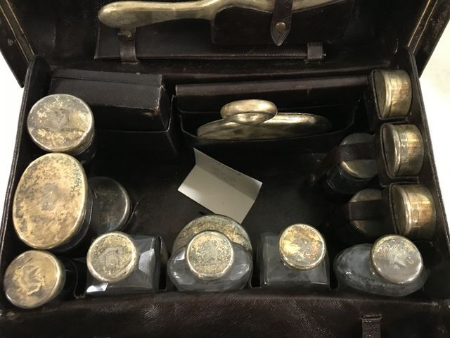 Pittway Brothers London Traveling Dressing Set, silver plated, jars for medicines, ointments, hair oil and unguents; combs and hairbrushes, missing some grooving pieces, fold out case, latch is non functional, 9"h., 14"w. A. C. H. initials. Pittway Brothers London Traveling Dressing Set, silver plated, jars for medicines, ointments, hair oil and unguents; combs and hairbrushes, missing some grooving pieces, fold out case, latch is non functional, 9"h., 14"w. A. C. H. initials.