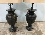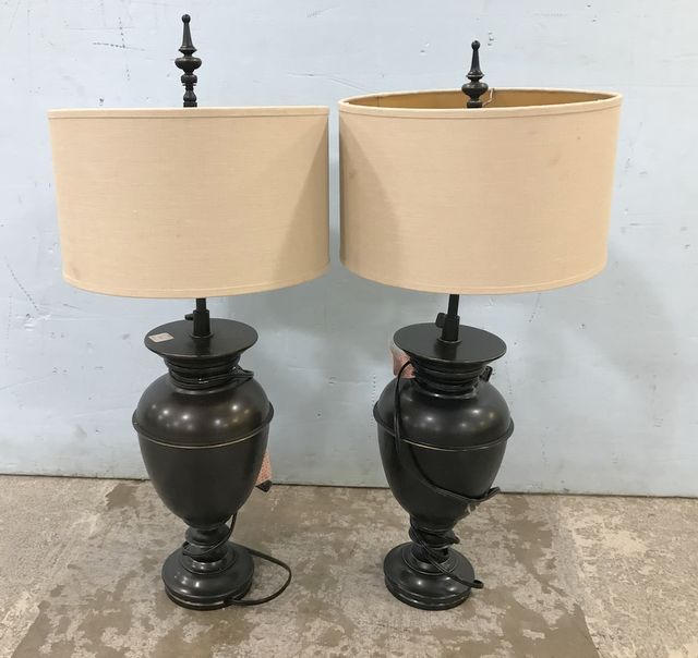 Pair of Decor Painted Metal Urn Lamps, good condition, with shades, 30"h. Pair of Decor Painted Metal Urn Lamps, good condition, with shades, 30"h.