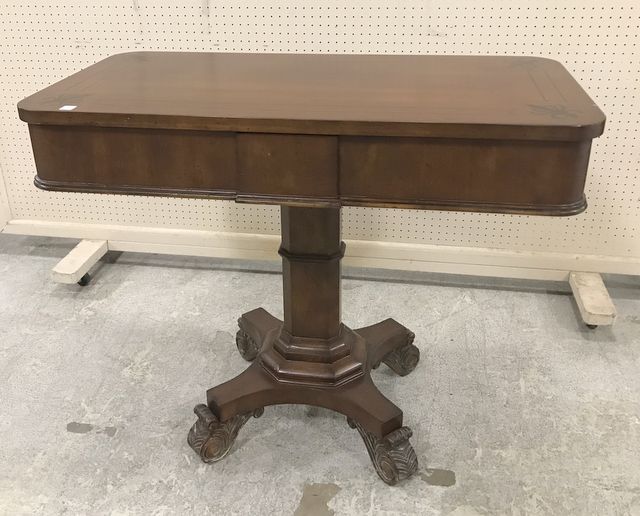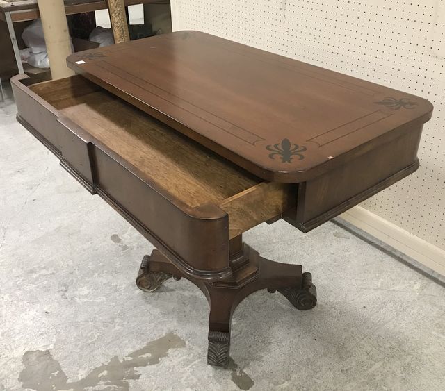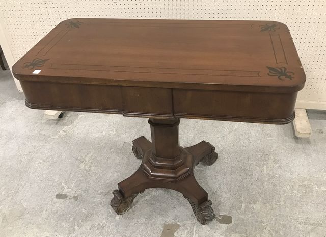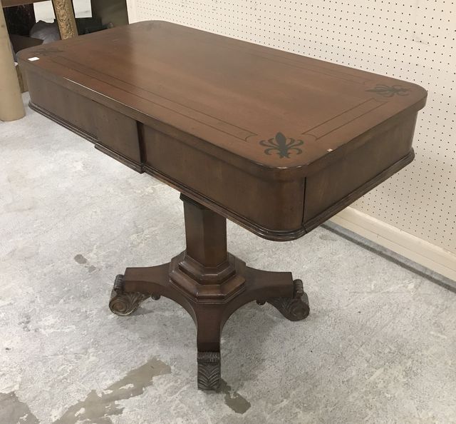 Antique Reproduction French Style Console Pedestal Table single drawer, inlaid design top, good condition, 35"h., 43"w., 22"d. Antique Reproduction French Style Console Pedestal Table single drawer, inlaid design top, good condition, 35"h., 43"w., 22"d.