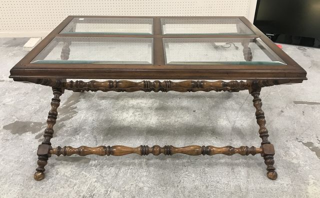 Rectangle four beveled glass panel top cocktail table, antique style, good condition, 20"h., 43"w., 31"d. Rectangle four beveled glass panel top cocktail table, antique style, good condition, 20"h., 43"w., 31"d.