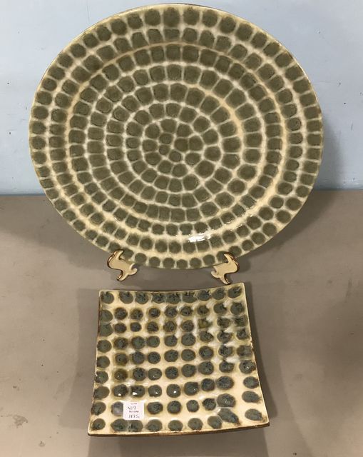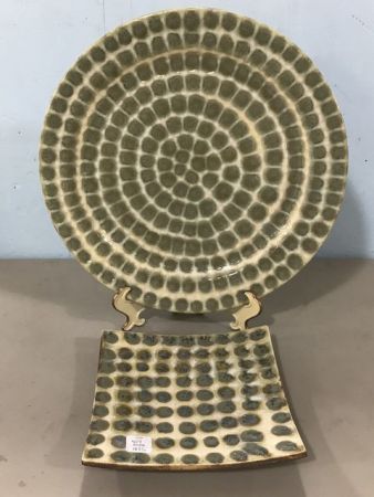 Good Earth Ceramic Hand Painted Pottery, signed Richie Watts signed 2003, charger 15"dia., and plate 8"w. Good Earth Ceramic Hand Painted Pottery, signed Richie Watts signed 2003, charger 15"dia., and plate 8"w.