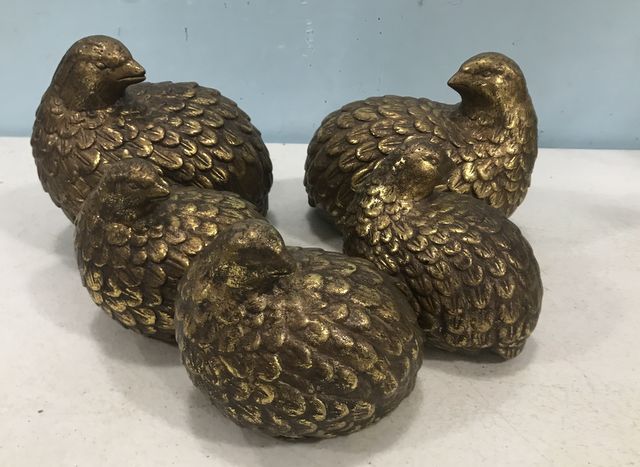 Five Gold Gilt Painted Ceramic Pheasants, assorted sized, decor, largest is 6"h. Five Gold Gilt Painted Ceramic Pheasants, assorted sized, decor, largest is 6"h.