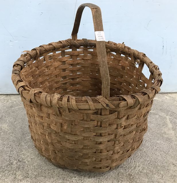 Antique Large River Cane Basket, split oak woven, handled (has crack), has age wear in woven wood, 20"h., 20"dia. Antique Large River Cane Basket, split oak woven, handled (has crack), has age wear in woven wood, 20"h., 20"dia.