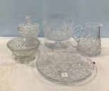 Five pressed glass serving pieces, round under plate, candy dish, heavy pitcher, center piece compote 9"h., depression era compote. Five pressed glass serving pieces, round under plate, candy dish, heavy pitcher, center piece compote 9"h., depression era compote.