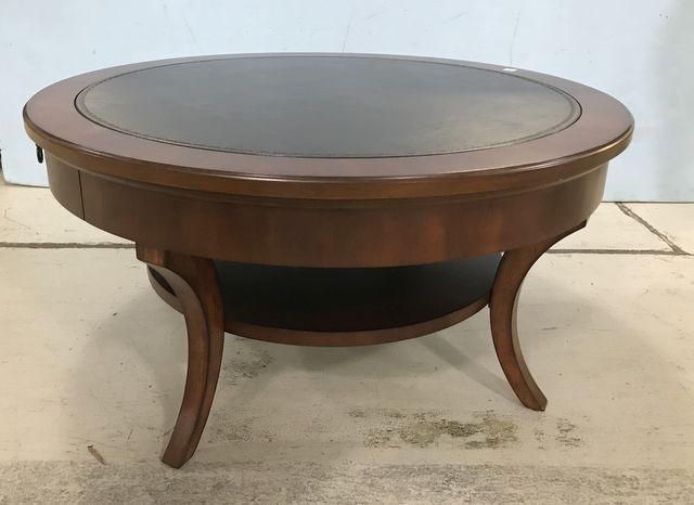 Modern Cherry Round Two Tier Coffee Table, vinyl top, two drawers, good condition, 20"h., 40"dia. Modern Cherry Round Two Tier Coffee Table, vinyl top, two drawers, good condition, 20"h., 40"dia.