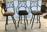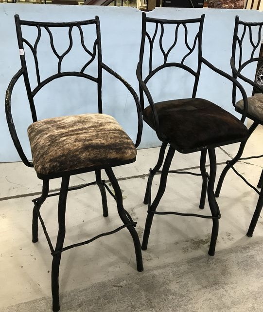 Three iron tree limb frame with cow hide seat cushions, 48"h., 30" seat to ground. Three iron tree limb frame with cow hide seat cushions, 48"h., 30" seat to ground.