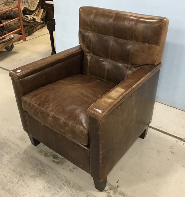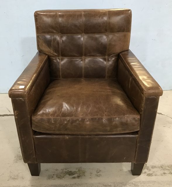 Brown Leather Arm Chair, used condition, no tear, some scuffs, 37"h., 30"w. Brown Leather Arm Chair, used condition, no tear, some scuffs, 37"h., 30"w.