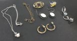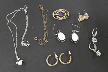 14 kt chain with faux pearl pendant, vintage style 14kt pin, sterling earrings, marked loop clear stone earrings, .925 studs, pair of .925 earrings with center stones. 14 kt chain with faux pearl pendant, vintage style 14kt pin, sterling earrings, marked loop clear stone earrings, .925 studs, pair of .925 earrings with center stones.